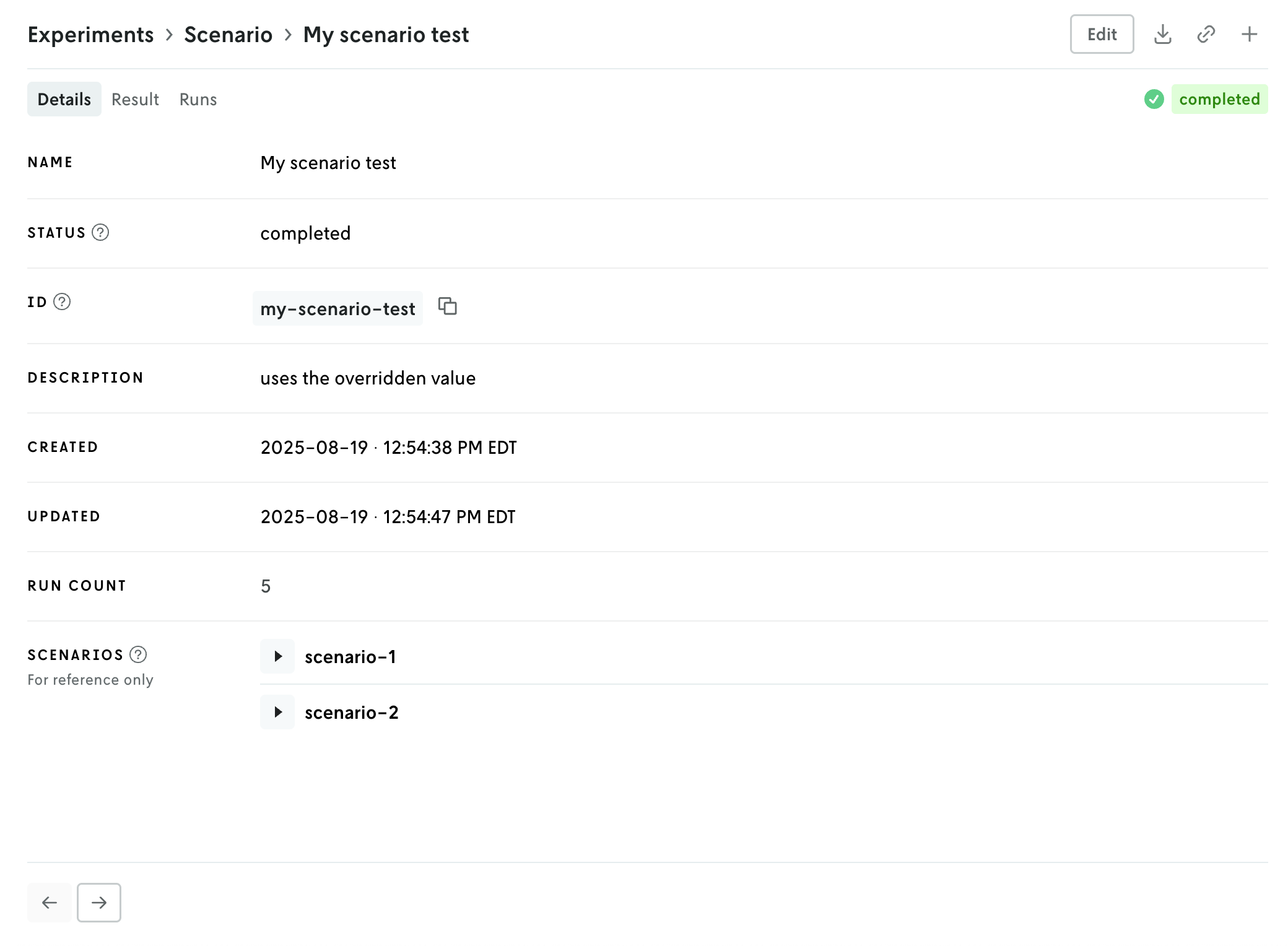 Scenario tests now have a tabbed interface for the details view that separates the result, runs, and test details. This separates the test results for easier viewing and allows you to share a specific view (e.g. the test result) with others via the share button in the header (or copying the URL directly).