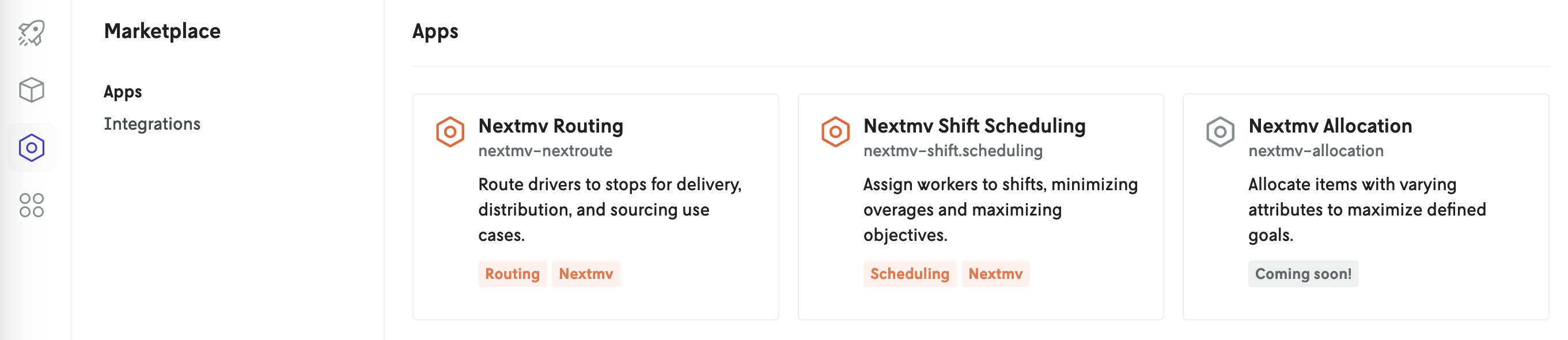The Nextmv routing app on marketplace provides a low-code entry point to the Nextmv platform and is the recommended starting point when solving a vehicle routing problem. It is a pre-built app with out-of-the-box functionality available now on Nextmv Cloud. (See the vehicle routing features page for a complete list of what's included).